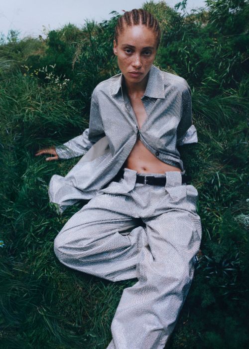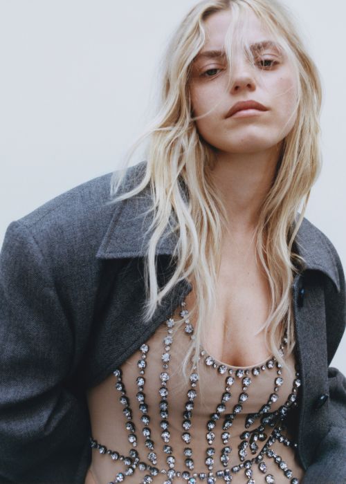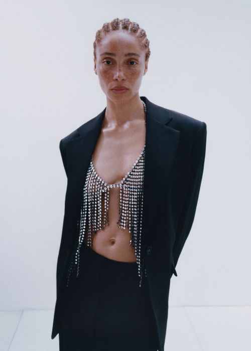 La colección une el pasado y el presente, combinando los queridos elementos distintivos actuales, como las camisas oversize, las gabardinas amplias y la sastrería impecable, con los icónicos y divertidos éxitos de los primeros archivos de McCartney, incluyendo estampados con joyas y tops con frases icónicas.