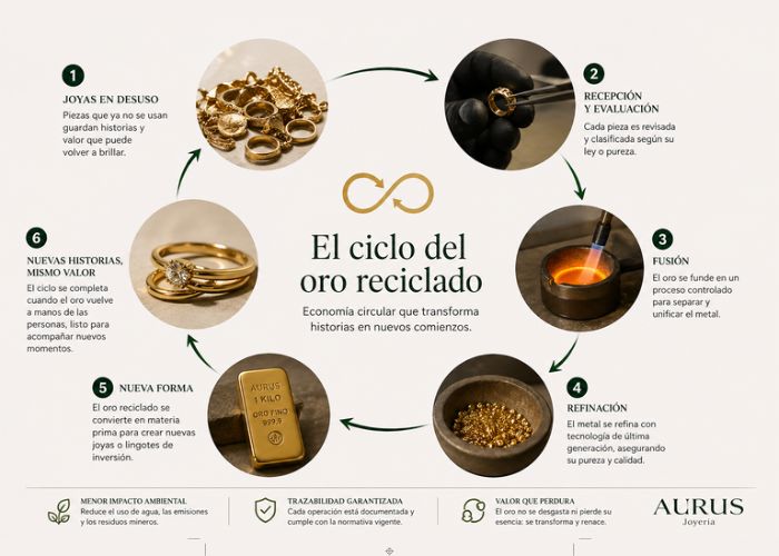 “Hoy estamos viendo un cambio estructural en cómo se entiende el valor de este metal. No se trata solo de cuánto pesa o cuánto cuesta, sino de dónde viene y qué impacto tiene. El reciclaje permite mantener el mismo estándar de calidad, pero bajo una lógica mucho más consciente”, explica Juan Carlos Cano, gerente comercial de Aurus Joyería.