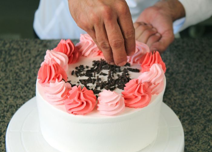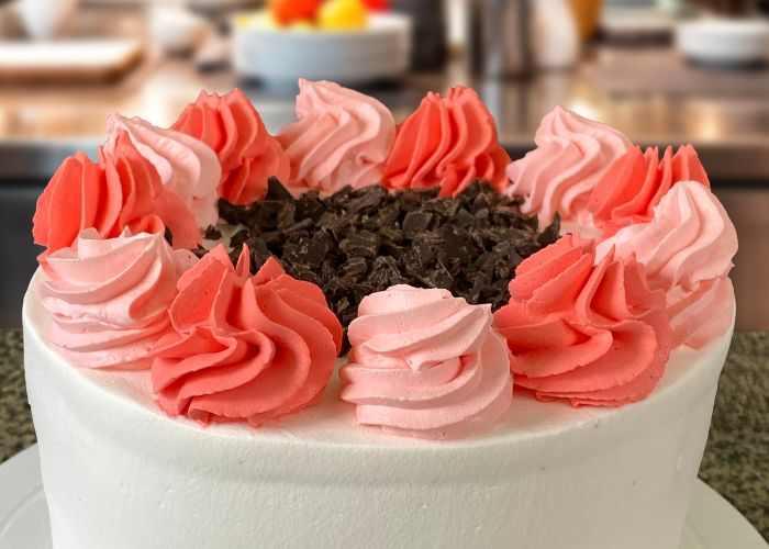 Posteriormente, la torta se cubre con crema vegetal Decor Up batida en punto chantilly, logrando una textura firme, aireada y estable, clave para un acabado prolijo y versátil. La decoración queda abierta a la creatividad: desde terminaciones con manga pastelera hasta frutas frescas o chocolate, incorporando pequeños detalles que elevan la presentación final.