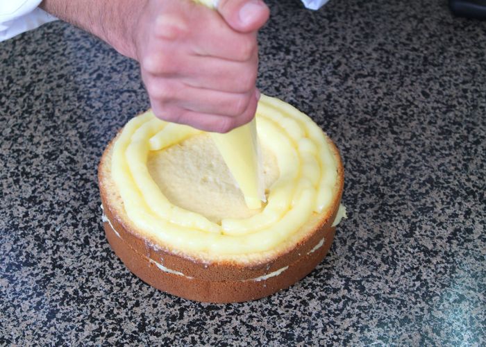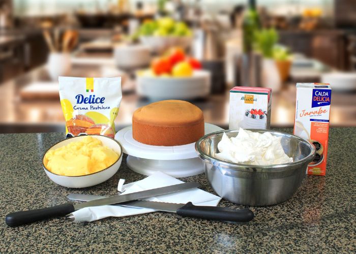 Para una torta de 18 cm de diámetro, la receta base considera un bizcocho de vainilla dividido en capas, humedecido con jarabe tres leches y relleno con crema pastelera, para luego ser cubierto con crema vegetal batida en punto chantilly, logrando una textura firme, aireada y estable, clave para un acabado profesional. El armado continúa con la incorporación de crema pastelera Delice, aplicada en las primeras capas junto al remojo Tres Leches Calda Delicia, generando un equilibrio entre humedad y cremosidad. Este último producto es, sin duda el protagonista, permitiendo mantener la identidad clásica de la preparación.