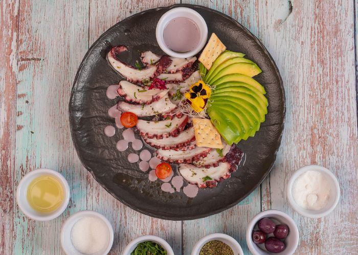 La carta de Hijo del Sol destaca por sus pisco sours y chilcanos, y sus platos tradicionales como el Lomo Saltado con papas fritas y arroz, el fresquísimo Ceviche de pescado y el suave Pulpo al Olivo, entre otros. En las alternativas dulces, sus Suspiros de Limeña son capaces de hacer suspirar a todos los comensales.