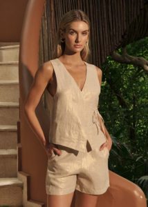Cada pieza de NATIVA refleja una visión contemporánea del lujo consciente. Los trajes de baño y prendas resort fueron diseñados para fluir entre el descanso y la sofisticación, incorporando materiales nobles, texturas orgánicas y acabados que evocan el trabajo artesanal. La colección destaca por su versatilidad: bikinis con cortes envolventes, enterizos con estructuras fluidas y prendas de lino y algodón que transitan del día a la noche con naturalidad.